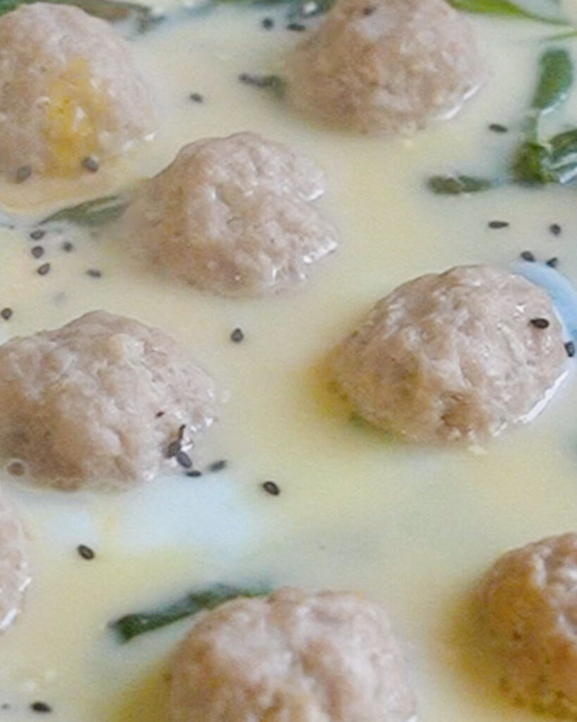 - Shape the minced meat into meatballs and place them on top of the spinach.